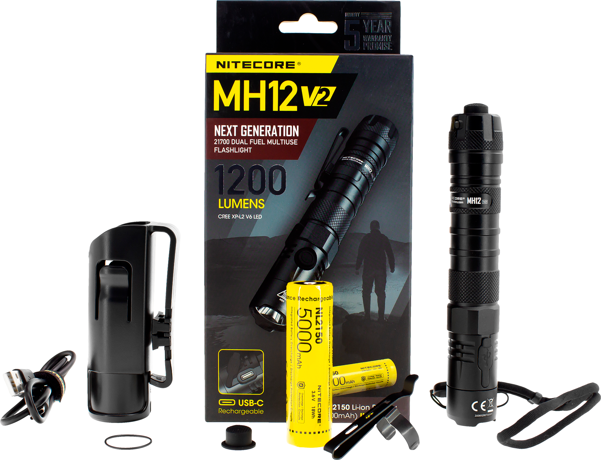Фонарь MH12 V2, Li-Ion аккумулятор NITECORE 21700 (NL2150 5000 мАч), зарядный кабель USB-C, клипса, темляк, запасное уплотнительное кольцо, переходник для аккумулятора 18650/CR123, тактический чехол-кобура NTH10.
