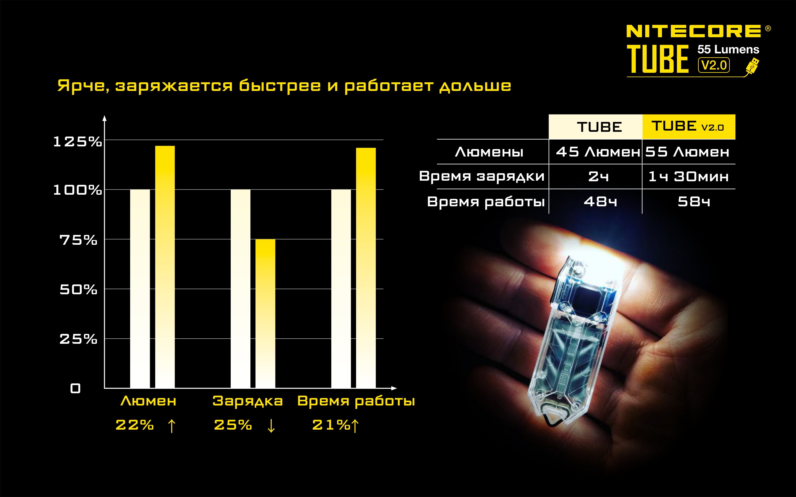 Модель Nitecore TUBE V2.0 одна из наиболее компактных среди всех представителей этого обширного семейства. Фонарь в состоянии светить белым с яркостью до 55 люмен и при этом располагает функцией плавной регулировки яркости. Он защищен от брызг и полностью непроницаем для пыли.