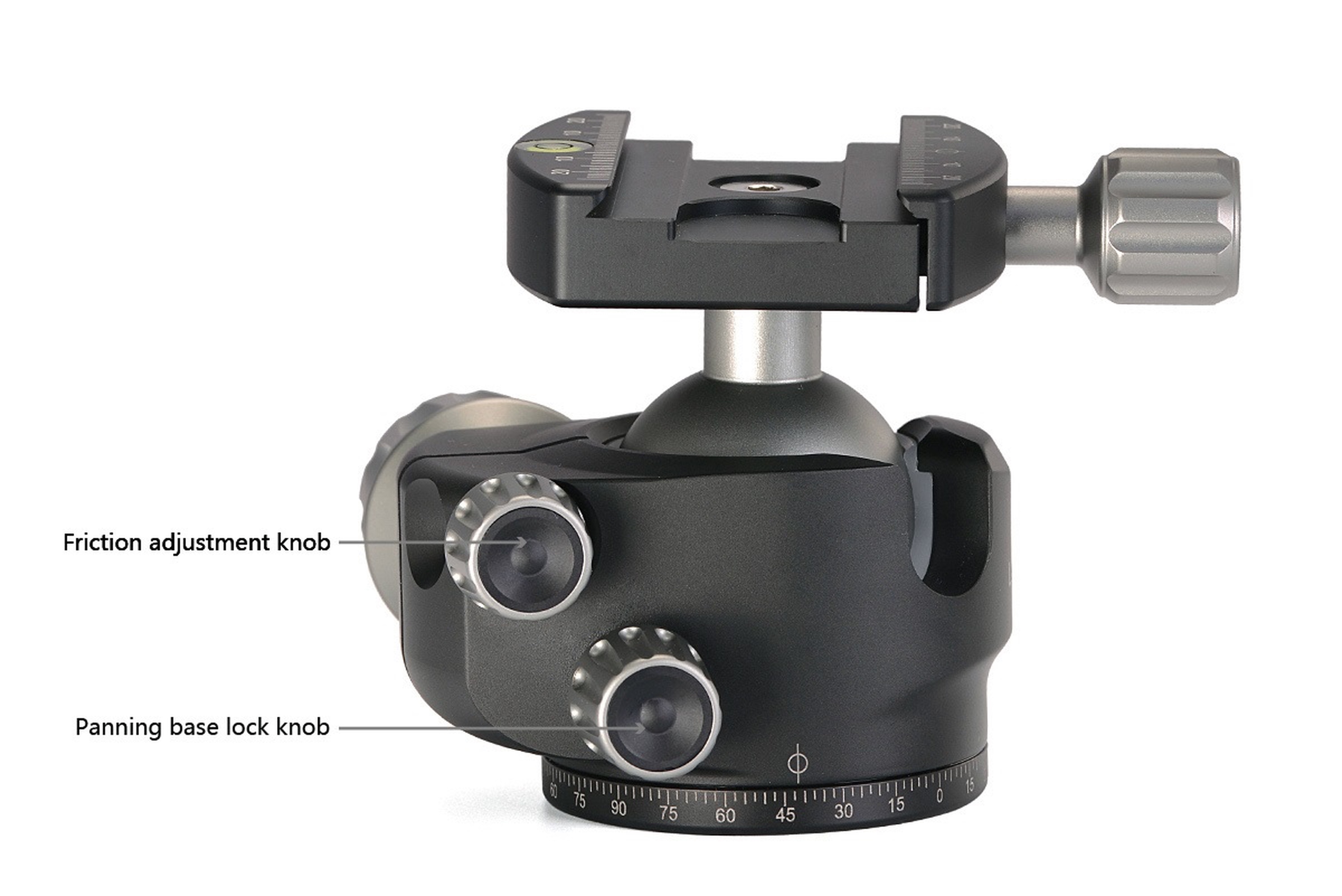 Голова Leofoto LH-40 проста и в то же время очень удобна в использовании. На голове расположены четыре регулирующих винта – фиксатор быстросъемной площадки, фиксатор шара, регулятор трения шара и фиксатор поворотного основания. Двойные выемки под шаром позволяют молниеносно переключаться между разными углами обзора.