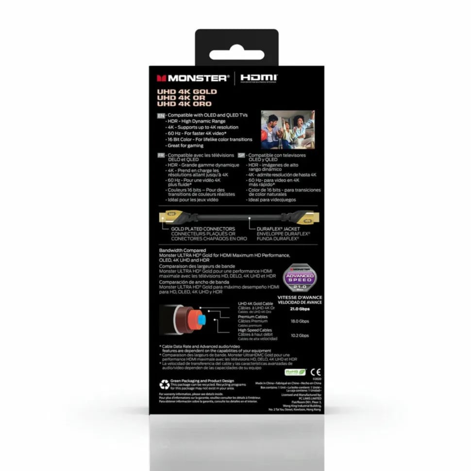Monster Cable Essentials UHD 4K GOLD - это сверхвысокоскоростной HDMI 2.0 кабель с поддержкой разрешения до 4К@60 Гц, скоростью передачи данных до 25 Гбит/с, Ethernet каналом и реверсивным аудиоканалом ARC.