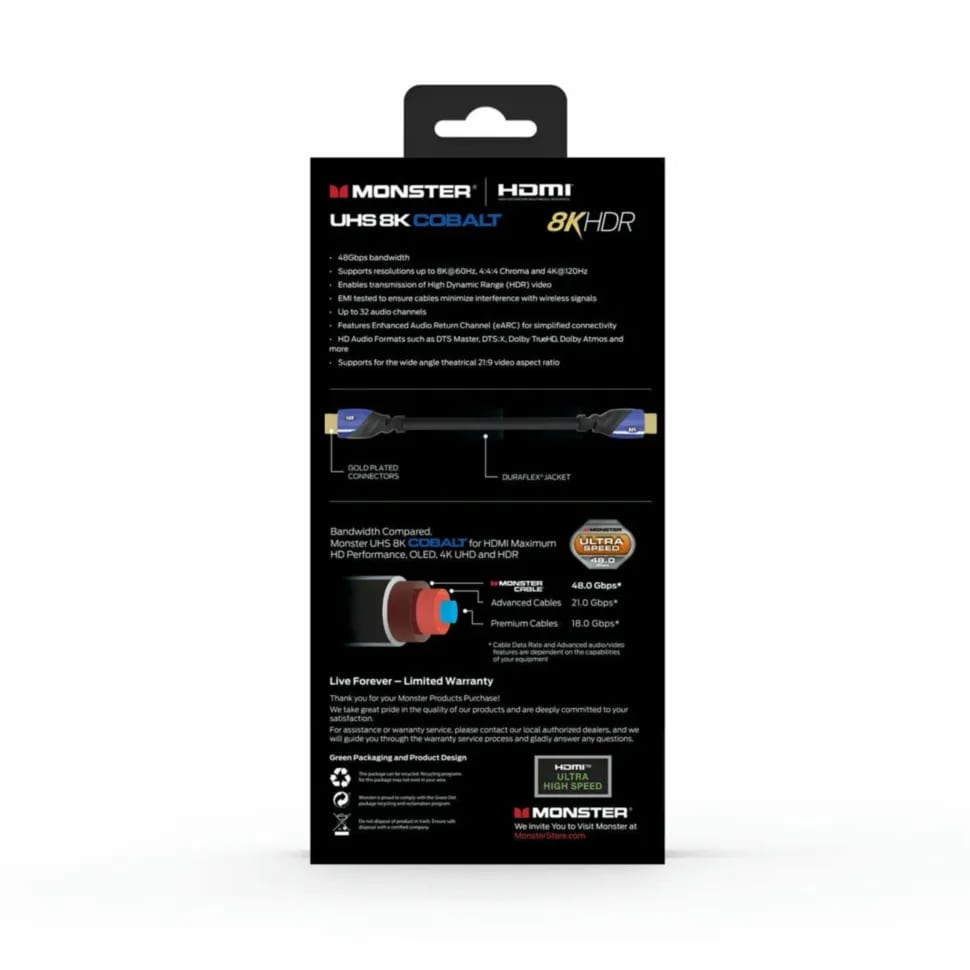 Monster Cable Essentials UHS 8K COBALT - это ультравысокоскоростной HDMI 2.1 кабель с поддержкой разрешения до 8К@60 Гц и 4К@120 Гц, скоростью передачи данных до 48 Гбит/с и расширенной версией реверсивного аудиоканала eARC.