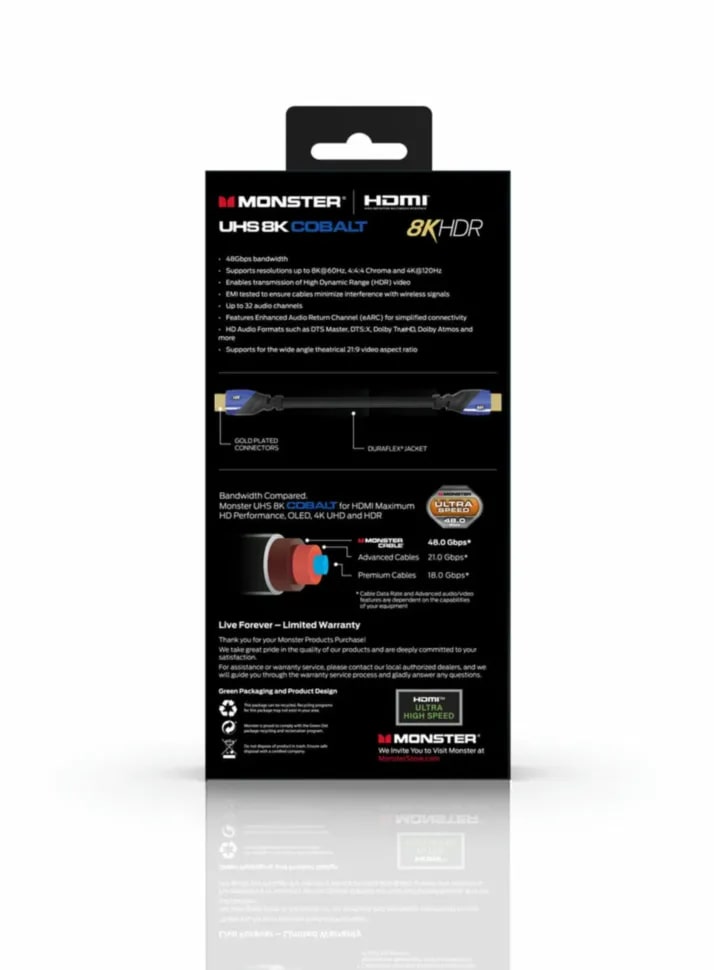 Monster Cable Essentials UHS 8K COBALT - это ультравысокоскоростной HDMI 2.1 кабель с поддержкой разрешения до 8К@60 Гц и 4К@120 Гц, скоростью передачи данных до 48 Гбит/с и расширенной версией реверсивного аудиоканала eARC.