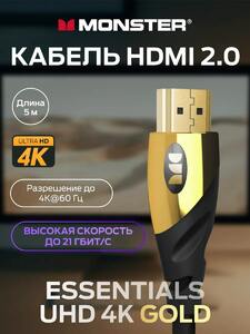 Monster Cable Essentials UHD 4K GOLD - это сверхвысокоскоростной HDMI 2.0 кабель с поддержкой разрешения до 4К@60 Гц, скоростью передачи данных до 25 Гбит/с, Ethernet каналом и реверсивным аудиоканалом ARC.