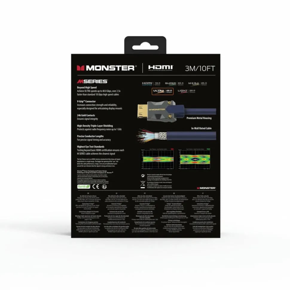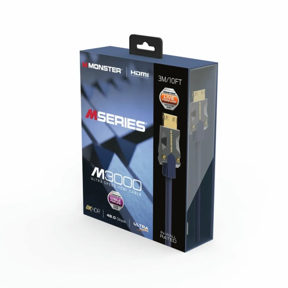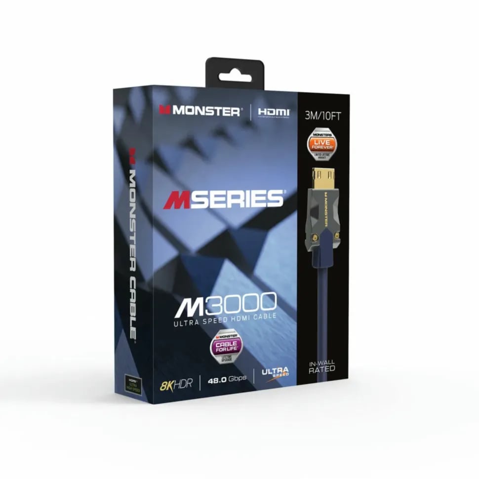 Monster Cable M-series M3000 - это ультравысокоскоростной HDMI 2.1 кабель с поддержкой разрешения до 8К@60 Гц и 4К@120 Гц, скоростью передачи данных до 48 Гбит/с и расширенной версией реверсивного аудиоканала eARC.