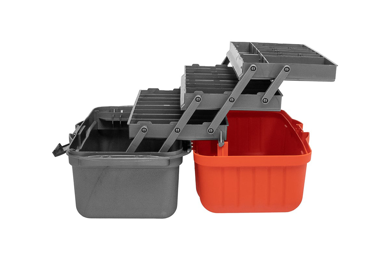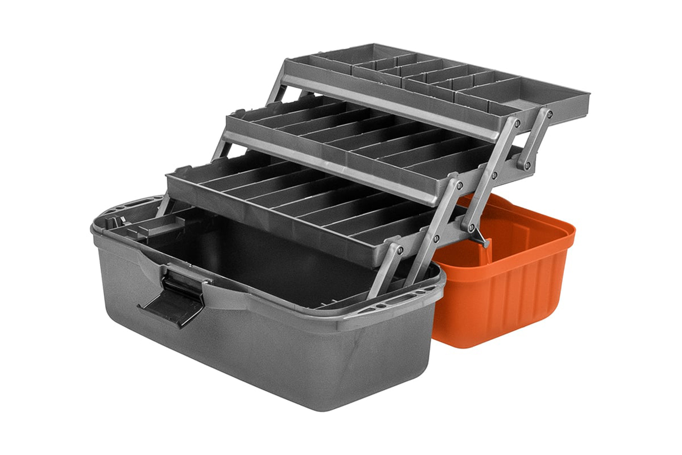 Удобный и вместительный ящик с тремя выдвижными полками для различной рыболовной оснастки: поплавков, приманок, крючков и другой полезной мелочи. Количество секций варьируется от 24 до 34. На дно ящика можно положить 1-3 спиннинговых катушек.