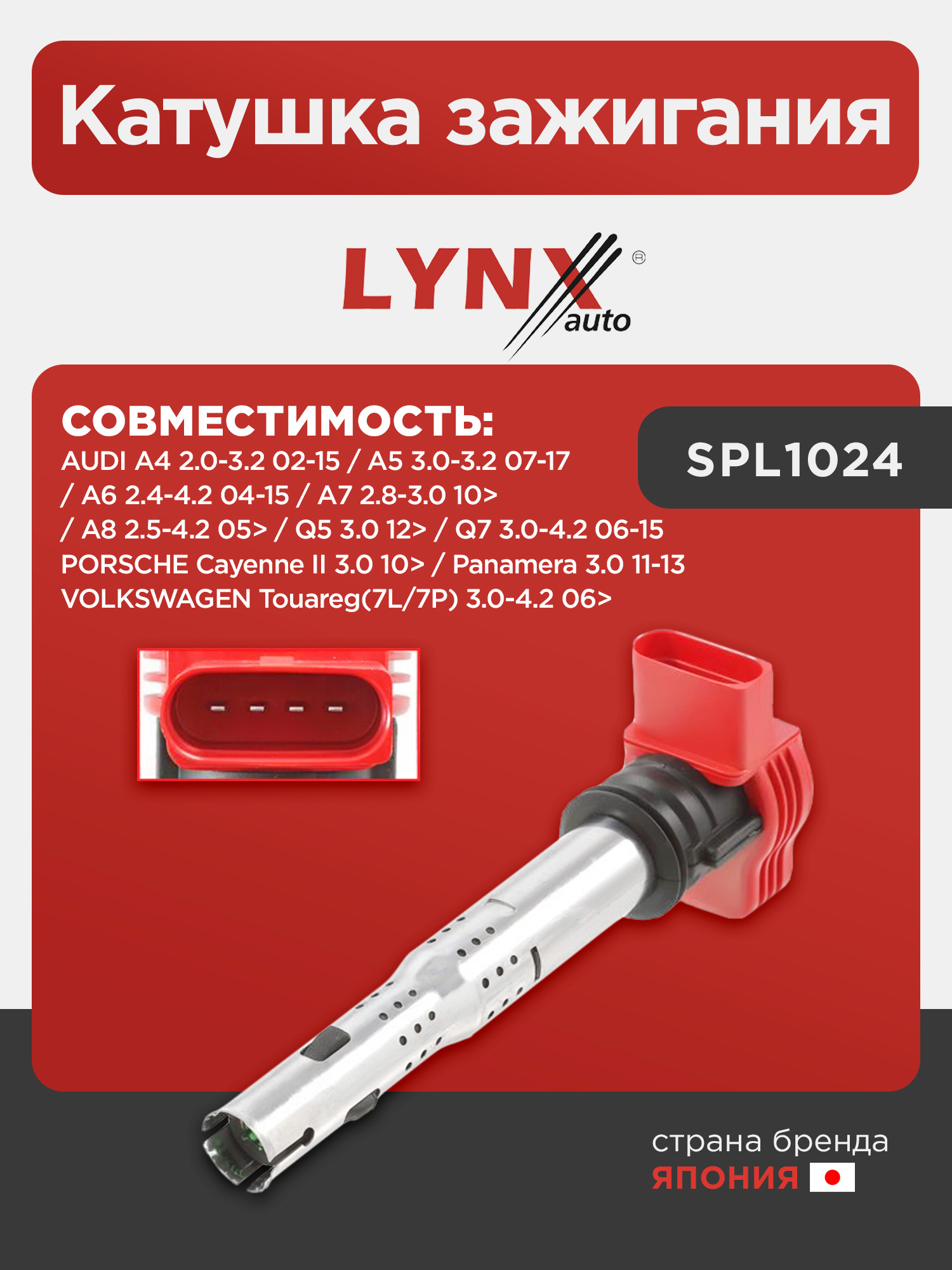 Катушка зажигания LYNXauto SPL1024. Для: AUDI Ауди A4 2.0-3.2 02-15 / A5 3.0-3.2 07-17 / A6 2.4-4.2 04-15 / A7 2.8-3.0 10> / A8 2.5-4.2 05> / Q5(Ку5) 3.0 12> / Q7(Ку7) 3.0-4.2 06-15, PORSCHE Cayenne II 3.0 10> / Panamera 3.0 11-13, Touareg(7L/7P) 3.0-4.2