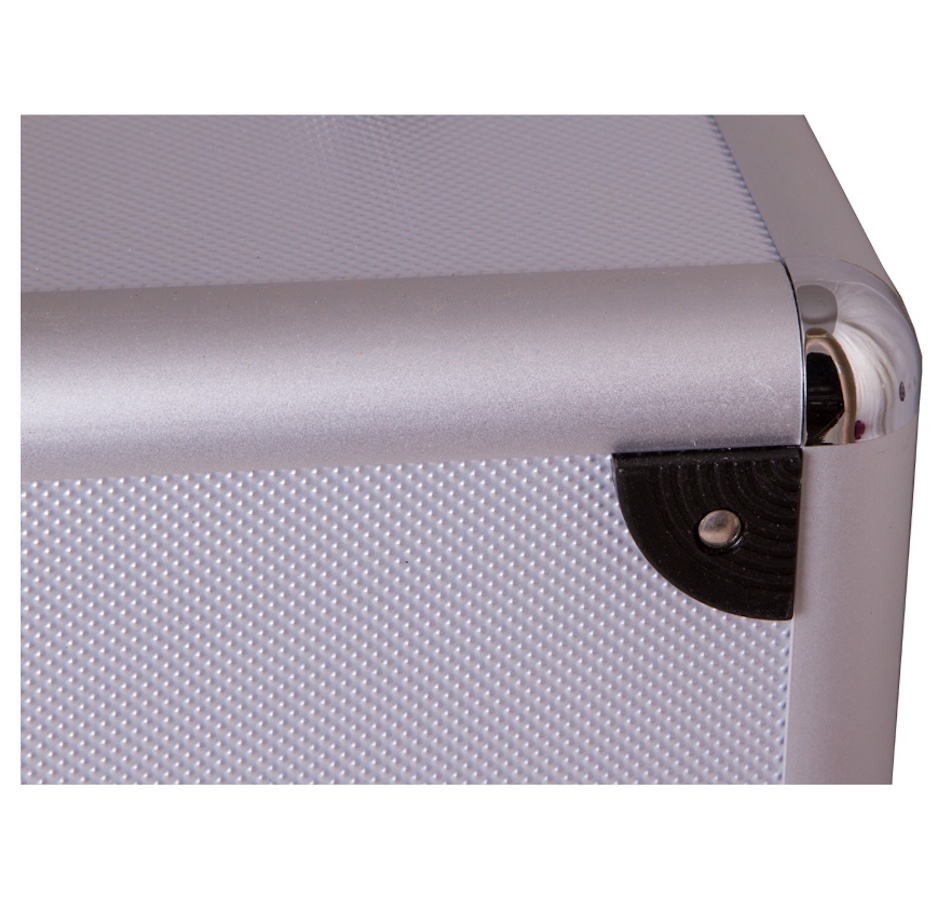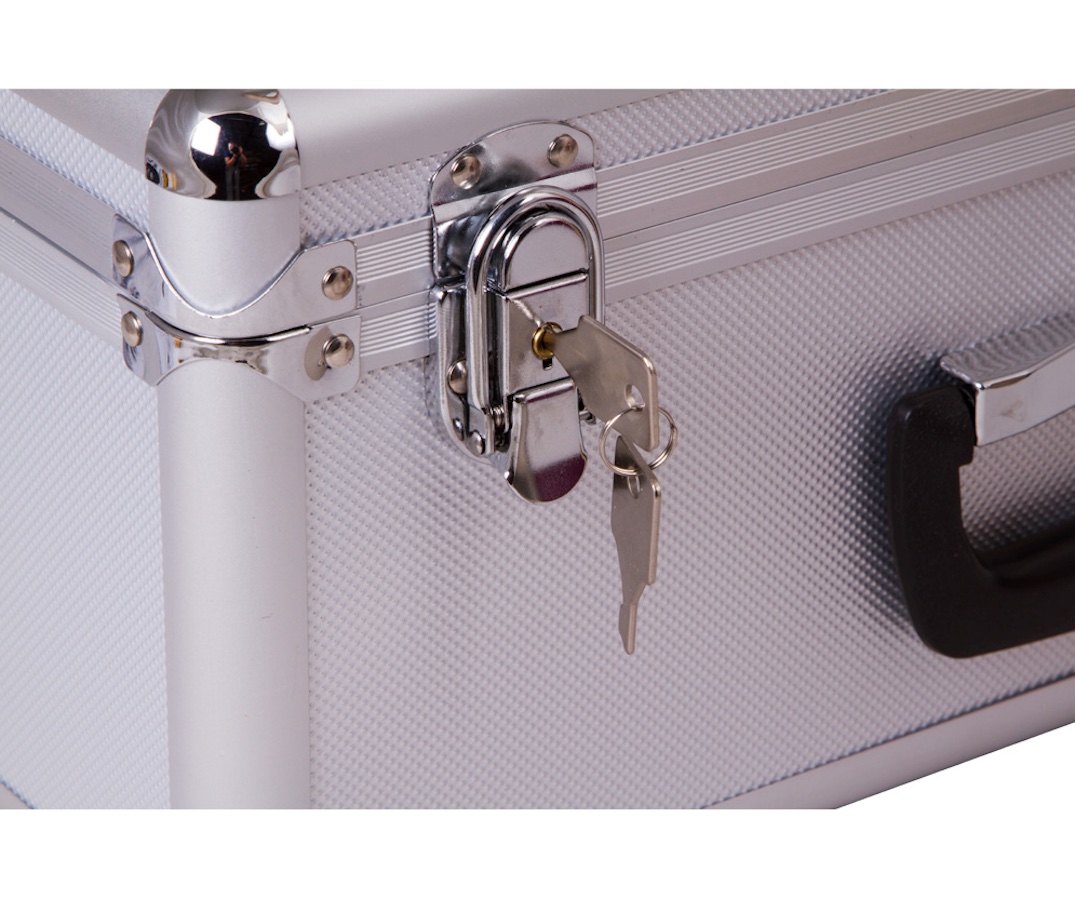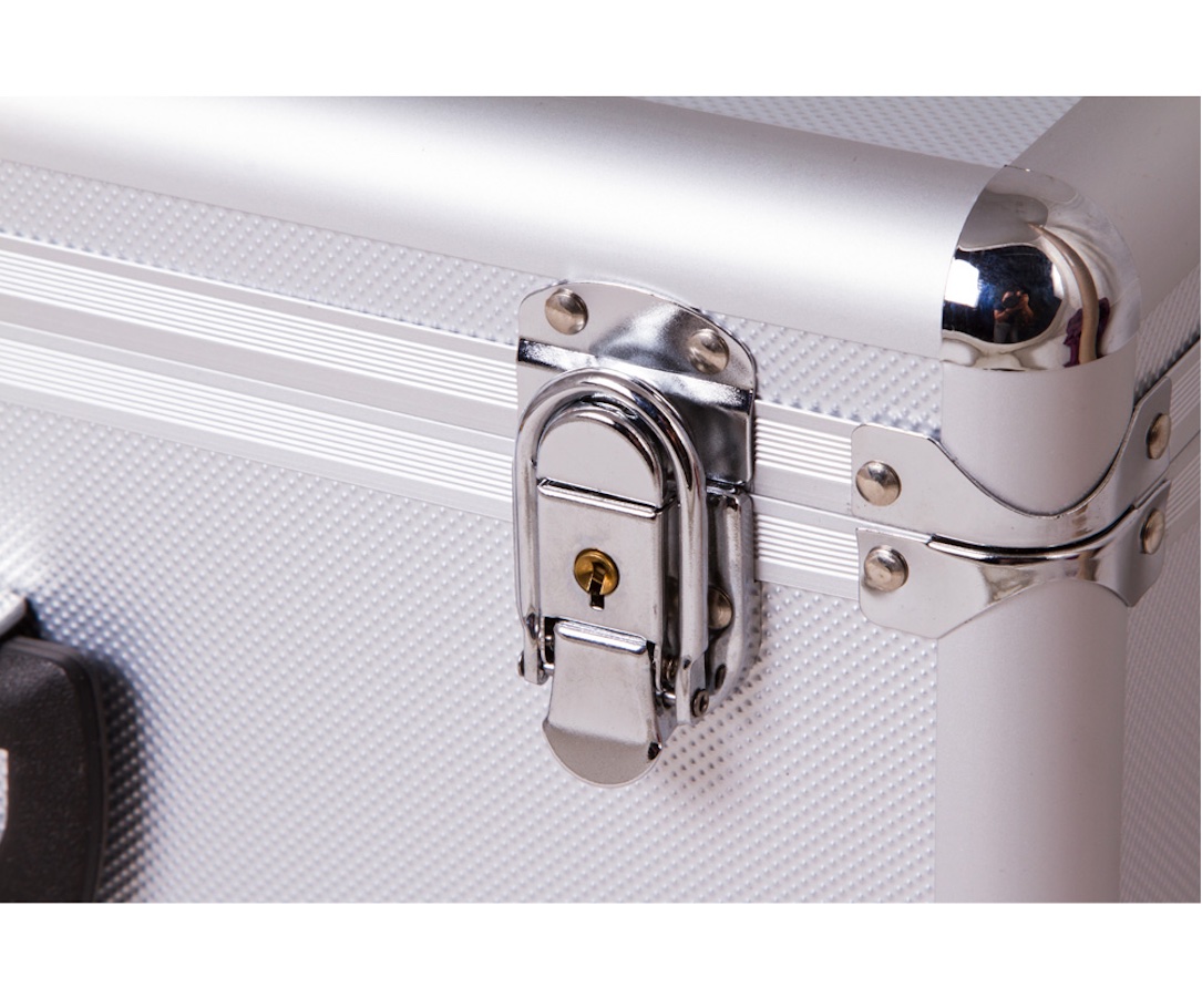 Внешние поверхности кейса сделаны из алюминия. Ребра и углы усилены металлическими пластинами. Есть ручка для переноски и два замка. Их можно закрыть на ключ, который входит в комплект поставки.