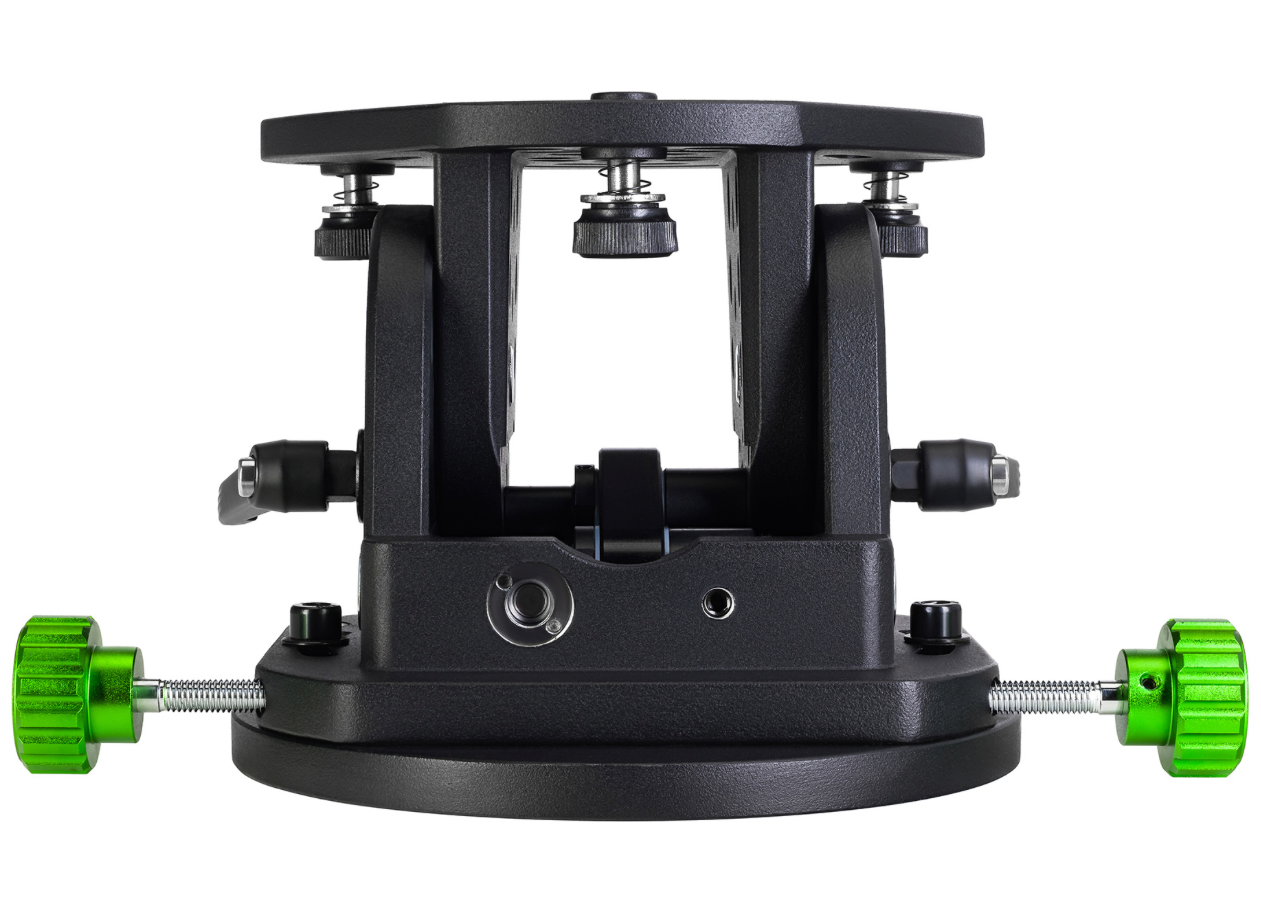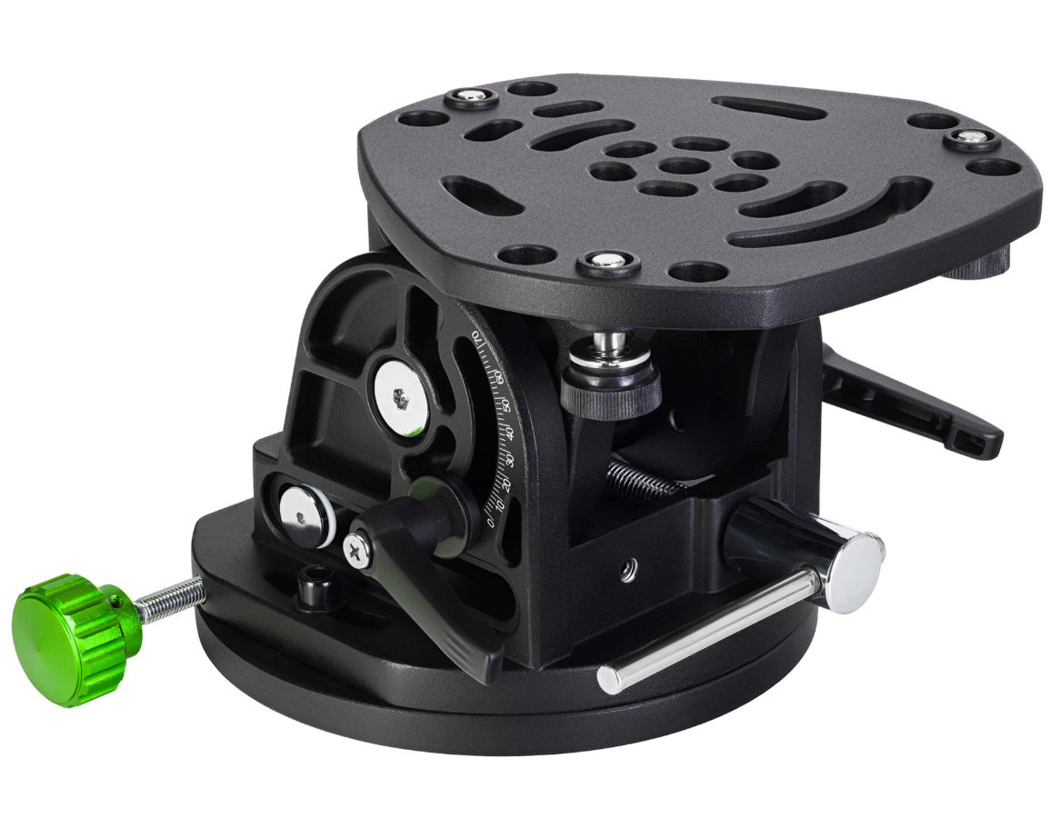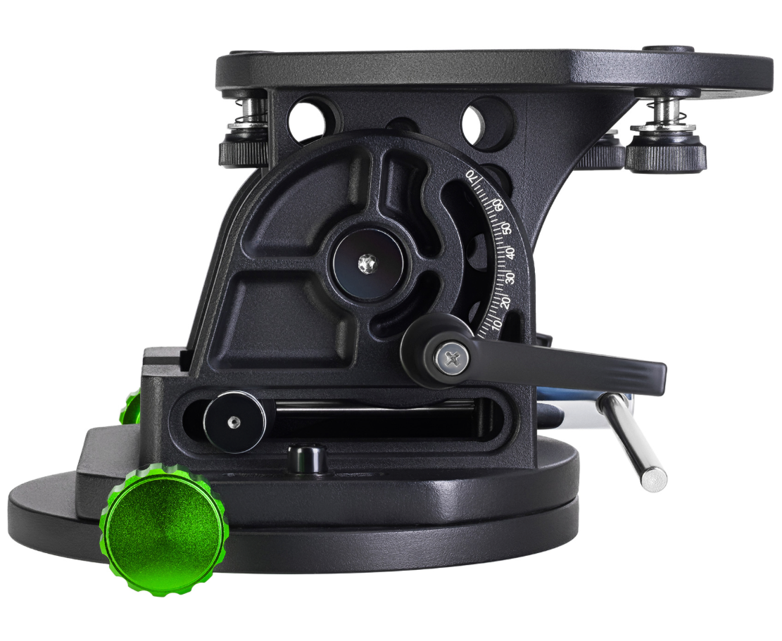 Вес экваториального клина составляет 4 кг, максимальная грузоподъемность – 15 кг. Широта регулируется в диапазоне от 0° до 70°, а азимут – в пределах ±15°. Угол наклона аксессуара легко меняется без дополнительных настроечных инструментов даже при его полной загруженности. Для точной регулировки широты на клине предусмотрена специальная информативная шкала.