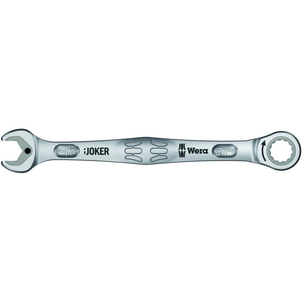 Высококачественный дюймовый комбинированный гаечный ключ с трещоткой фирмы Wera: всё, что должен делать гаечный ключ, и даже много больше. Быстрее, лучше, красивее. Прямо-таки настоящий Joker. Новое поколение комбинированных гаечных ключей с трещоткой для шестигранных винтов и гаек. С фиксирующей функцией с помощью металлической пластины в рожковой части, которая снижает риск потерять винт или гайку. Сменная металлическая пластина в рожковой части своими сверхтвердыми зубцами фиксирует винты и гайки и снижает риск их соскальзывания. Имеющийся упор может предотвратить соскальзывание ключа вниз с головки винта и позволяет приложить большее усилие. Форма двойного шестигранника обеспечивает плотный обхват винта или гайки и тем самым снижает риск соскальзывания. Угол возврата всего 30° в рожковой части исключает потерю времени на перекидывание ключа при завинчивании. Конструкция трещотки в накидной части ключа с необычайно тонким механизмом зацепления на 80 зубцов для гибкой работы.