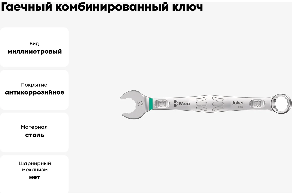 Гаечный комбинированный ключ 13 x 160 мм WERA 6003 Joker WE-020204 имеет высокую прочность, что позволяет работать с тугим крепежом.