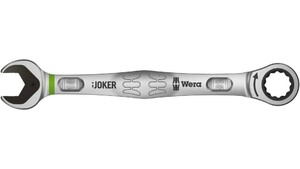 Высококачественный метрический комбинированный гаечный ключ с трещоткой фирмы Wera: всё, что должен делать гаечный ключ, и даже много больше. Быстрее, лучше, красивее. Прямо-таки настоящий Joker. Новое поколение комбинированных гаечных ключей с трещоткой для шестигранных винтов и гаек. С фиксирующей функцией с помощью металлической пластины в рожковой части, которая снижает риск потерять винт или гайку. Сменная металлическая пластина в рожковой части своими сверхтвердыми зубцами фиксирует винты и гайки и снижает риск их соскальзывания. Имеющийся упор может предотвратить соскальзывание ключа вниз с головки винта и позволяет приложить большее усилие. Форма двойного шестигранника обеспечивает плотный обхват винта или гайки и тем самым снижает риск соскальзывания. Угол возврата всего 30° в рожковой части исключает потерю времени на перекидывание ключа при завинчивании. Конструкция трещотки в накидной части ключа с необычайно тонким механизмом зацепления на 80 зубцов для гибкой ра