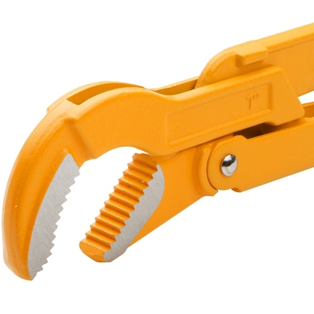 Газовый ключ с изогнутыми губками - профессиональный инструмент для надежного захвата и удержания труб, фитингов и резьбовых соединений при монтажных и демонтажных работах.