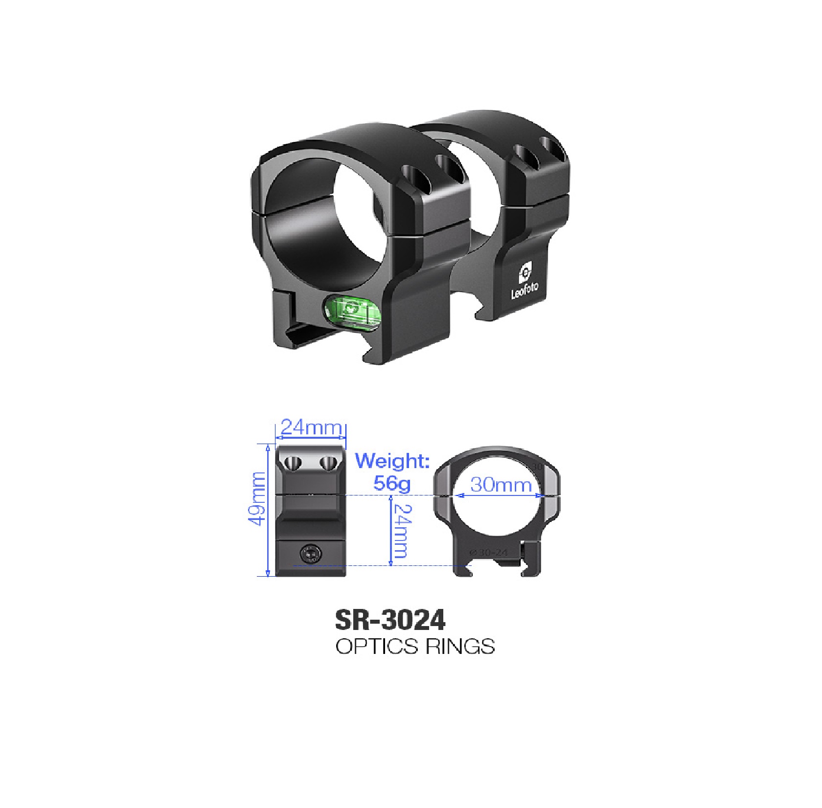 Leofoto на Picatinny с уровнем, D30мм, высота 24мм (SR-3024), состоит из двух тактических колец стандарта Picatinny. Используется для установки оптических прицелов с 30 мм центральной трубкой.