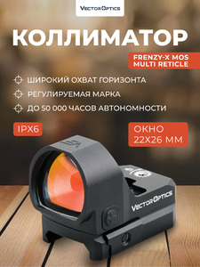 Коллиматорный прицел Vector Optics Frenzy-X 1x22x26 MOS MULTI RETICLES - универсальное решение для загонной охоты, динамичной стрельбы накоротке и военно-тактических дисциплин. Открытый коллиматорный прицел подходит для установки на пистолеты, ружья и другие виды длинноствольного оружия. Компактный прицел с продуманной конструкцией и широким набором полезных опций - отличный выбор для профессиональных охотников, начинающих и опытных спортсменов.