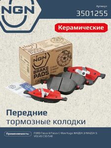 Колодки тормозные керамические, передние NGN 3501255. Для FORD Focus II/Focus C-Max/Kuga 08>, MAZDA 3 03> / MAZDA 5 05>, VOLVO C30 06> / S40 04>Комплектация: