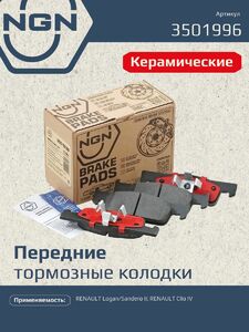 Колодки тормозные керамические передние NGN 3501996. Для RENAULT Logan/Sandero II 12 RENAULT Clio IV 12