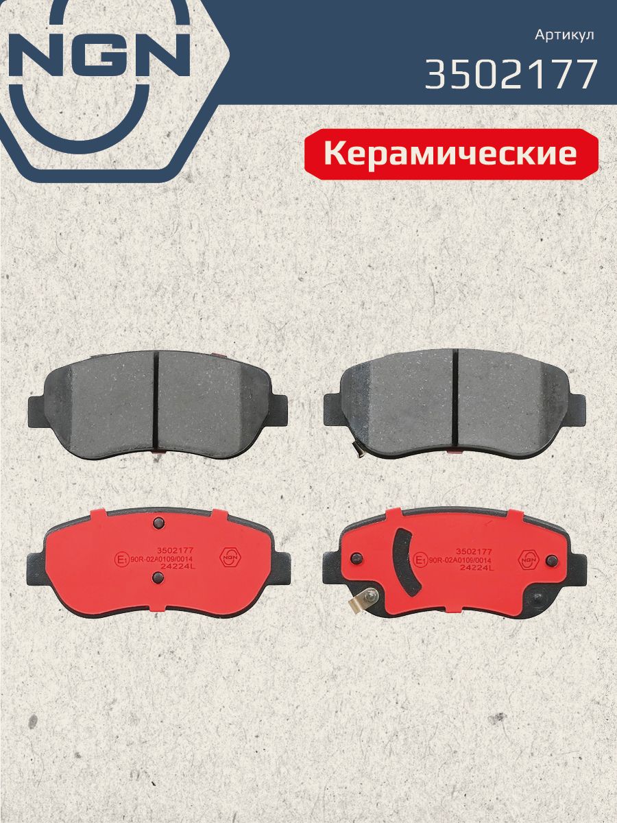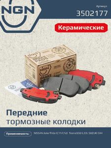 Колодки тормозные керамические, передние NGN 3502177. Для NISSAN Juke 10-19 / Tiida (C11/C12) 07> Teana(J32/L33) 03>, SUZUKI SX4 06-15Комплектация:
