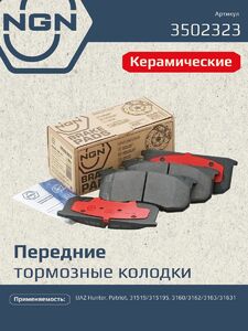 Колодки тормозные керамические, передние NGN 3502323. Для UAZ Hunter 03>, Patriot 97>, 31519/315195 97-19, 3160/3162/3163/31631 97-19Комплектация: