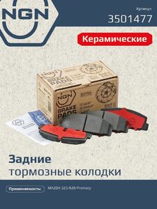 Колодки тормозные керамические, задние NGN 3501477. Для MAZDA 323 01-04/626 97-02/Premacy 99>Комплектация: