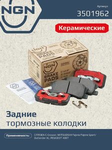Колодки тормозные керамические, задние NGN 3501962. Для CITROEN C-Crosser 07>, MITSUBISHI Pajero 00> / Pajero Sport 97> / Outlander XL 07>, PEUGEOT 4007 07>Комплектация: