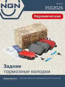 Колодки тормозные керамические, задние NGN 3502026. Для MERCEDES-BENZ A(W176) 12> / B(W246) 11> / CLA(C117) 13> / GLA(X156) 13>Комплектация: