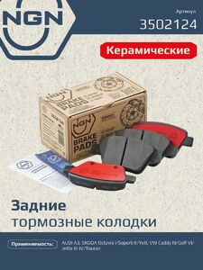 Колодки тормозные керамические задние NGN 3502124. Для AUDI A3 03-12 SKODA Octavia I 04-13 Superb II 08-15 Yeti 09 VW Caddy III 06-15 Golf VI 08-13 Jetta III-IV 05 Touran 03