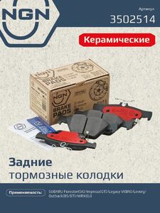 Колодки тормозные керамические, задние NGN 3502514. Для SUBARU Forester(SK) 18> / Impreza(GT) 16> / Legasy VI(BN) 15> / Levorg 15> / Outback(BS/BT) / WRX(GJ) 13>Комплектация: