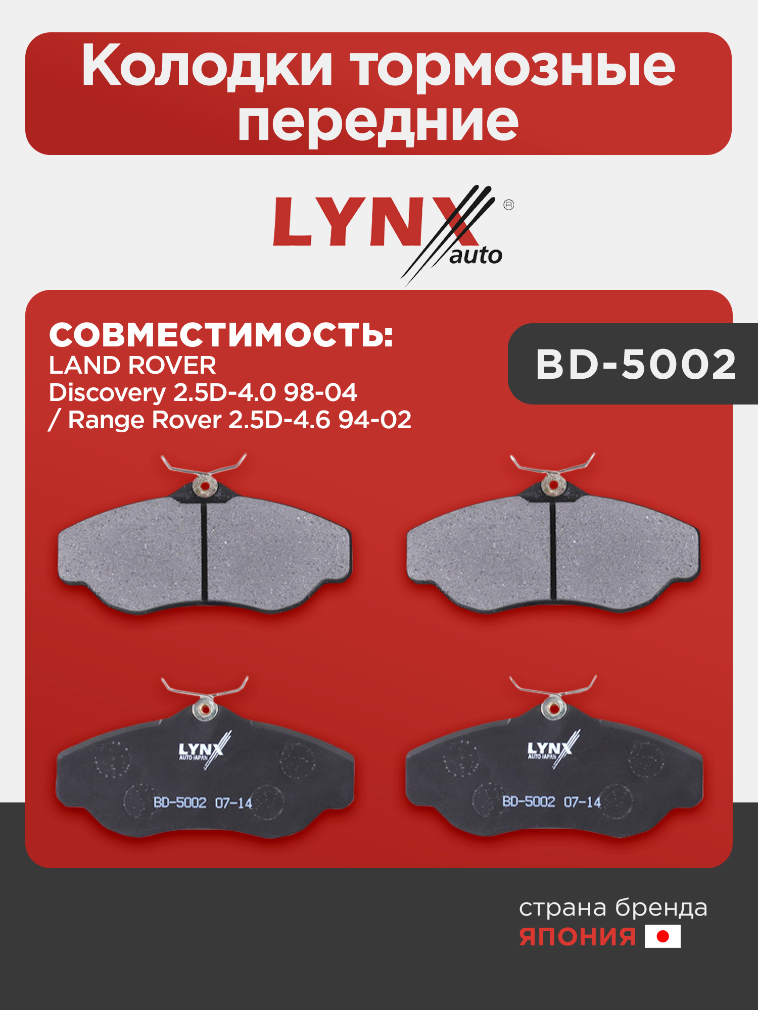 Колодки тормозные передние LYNXauto BD-5002. Для LAND ROVER Discovery 2.5D-4.0 98-04 / Range Rover 2.5D-4.6 94-02