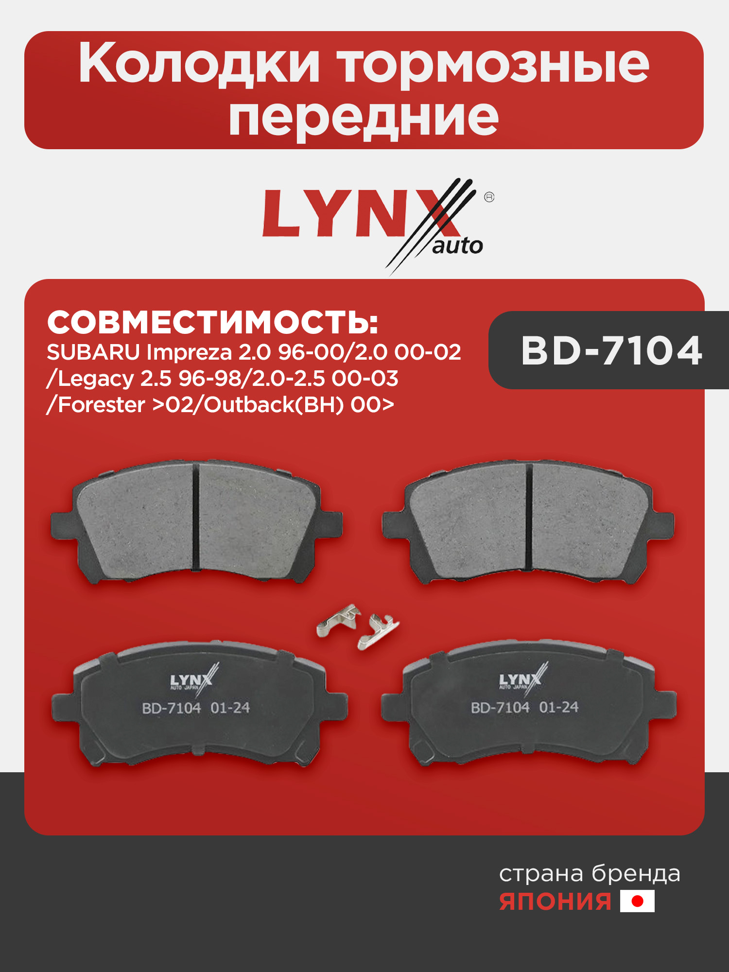 Колодки тормозные передние LYNXauto BD-7104. Для: SUBARU СУБАРУ Impreza(Импреза) 2.0 96-00/2.0 00-02/Legacy(Легаси) 2.5 96-98/2.0-2.5 00-03/Forester(Форестер) >02/Outback(BH) 00>