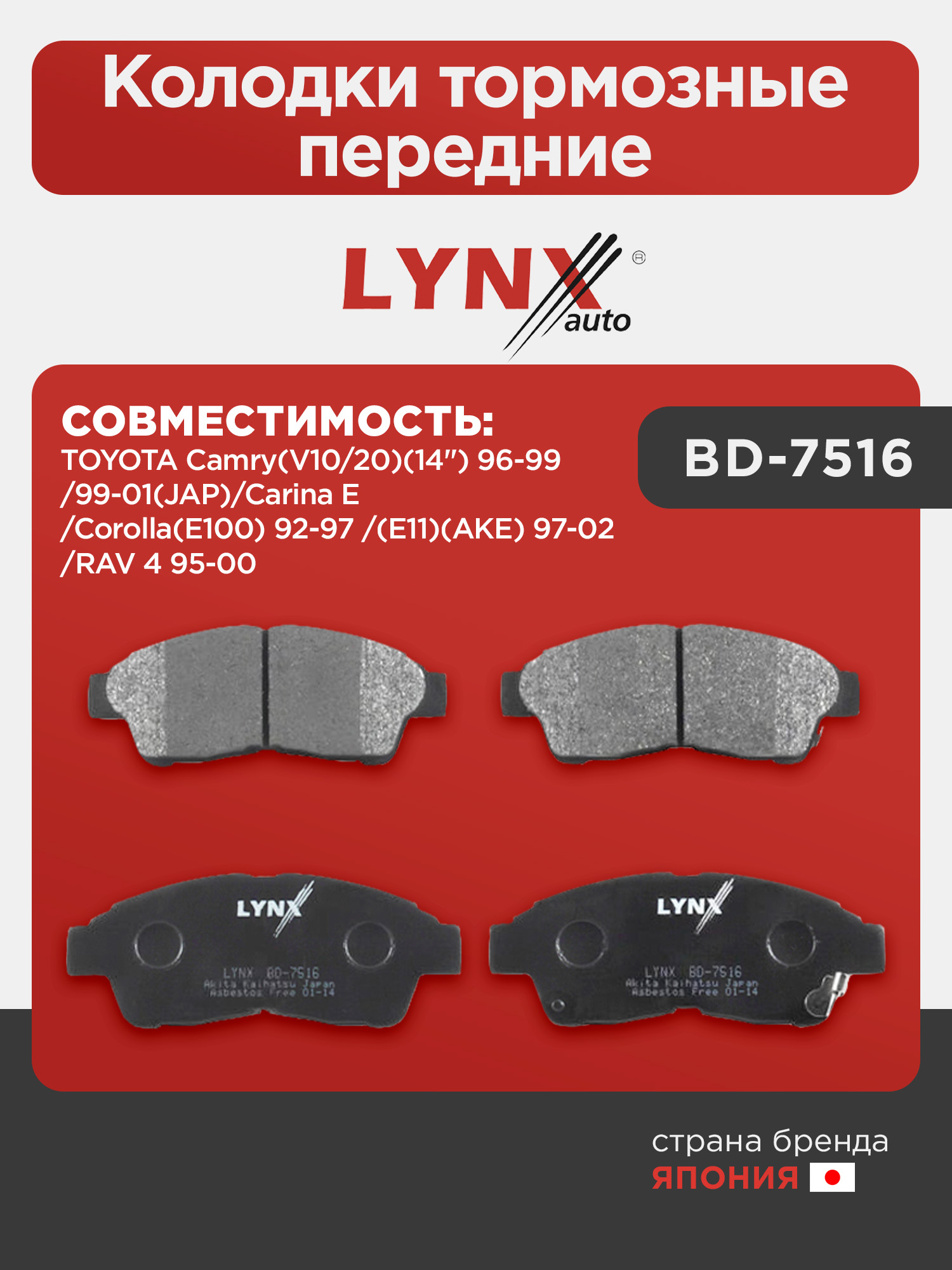 Колодки тормозные передние LYNXauto BD-7516. Для: Toyota, Тойота, Camry(Камри)(V10/20)(14") 96-99/99-01(JAP)/Carina(Карина) E/Corolla(Корола)(E100) 92-97/(E11)(AKE) 97-02/RAV(РАВ) 4 95-00.