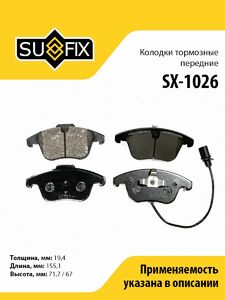 Колодки тормозные передние SUFIX SX-1026. Применение: AUDI A4 07-15 / A5 07-17. ОЕ: 8K0698151A; 8K0698151F.