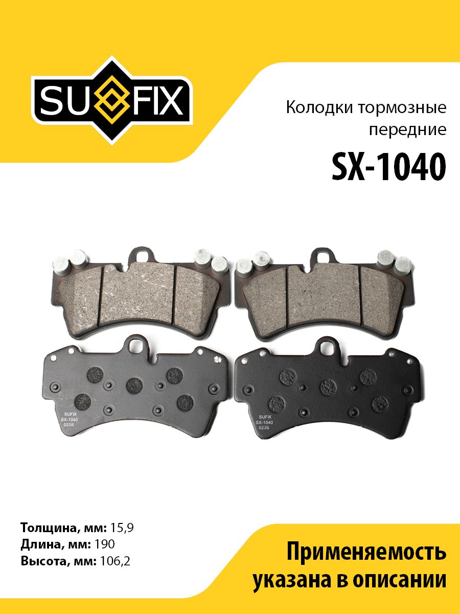 Колодки тормозные передние SUFIX SX-1040. Применение: AUDI Q7 3.0D-6.0D 07>, VW Touareg(7L) 3.6-6.0 02-10, PORSCHE Cayenne(955) 3.2-4.8TS 02-10. ОЕ: 4L0698151C; 7L0698151A; 7L0698151C; 7L0698151E; 7L0698151G; 7L0698151J; 7L0698151P; 7L6698151A; 7L6698151D; 95535193910; 95535193911; 95535193912; 95535193913; 95535193914; 95535193915.