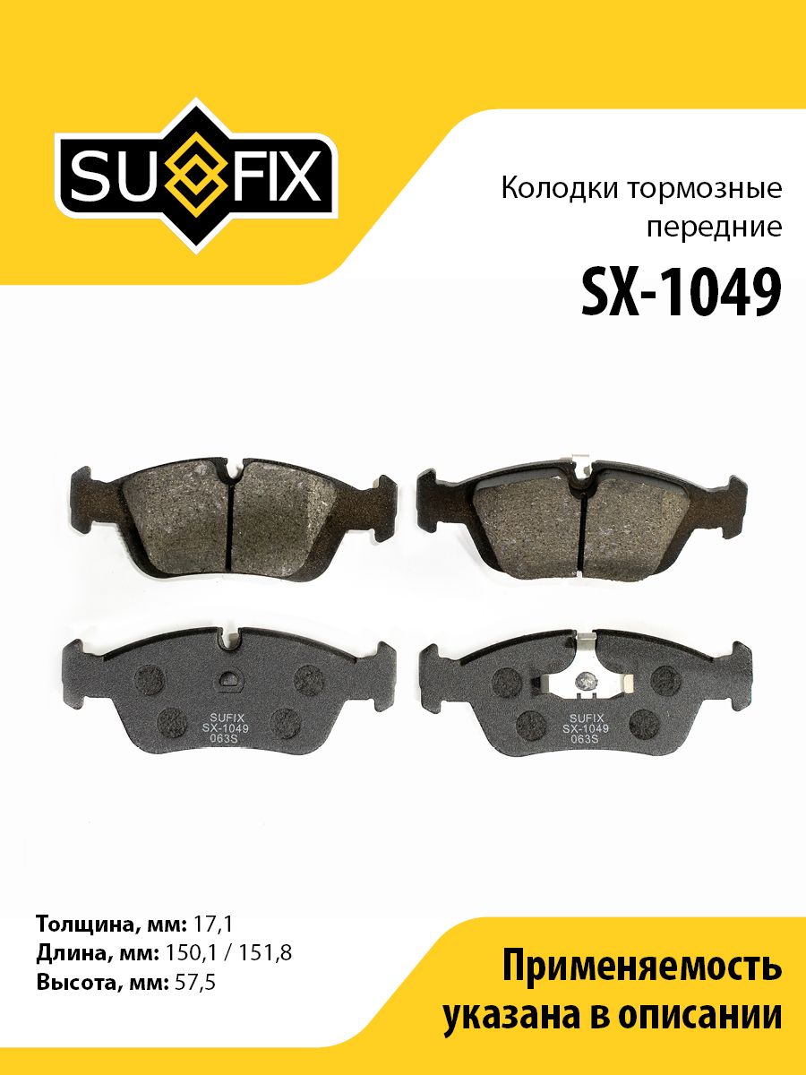Колодки тормозные передние SUFIX SX-1049. Применение: BMW 3 (E46) 1.6-2.5 98-05. ОЕ: 34111164498; 34111164500; 34111165555; 34116752482; 34116752731; 34116756128; 34116761237; 34116761242; 34116761244 .