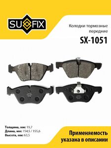 Колодки тормозные передние SUFIX SX-1051. Применение: BMW 3 (E90) 1.8-3.3 05> / 5 (E60) 2.0-2.5 03>. ОЕ: 34116763617; 34116763618; 34116769099; 34116769100; 34116771868; 34116799166 .
