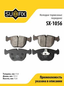 Колодки тормозные передние SUFIX SX-1056. Применение: BMW 5 (E39) 00-03/7(E38) 4.0 96-01/X3(E83) 3.0D 06> / X5(E53) 3.0-4.4. ОЕ: 34111163227; 34111163307; 34111165227; 34112229031; 34112282090; 34112282165; 34112282166; 34112282556; 34113427503; 34116761252 .