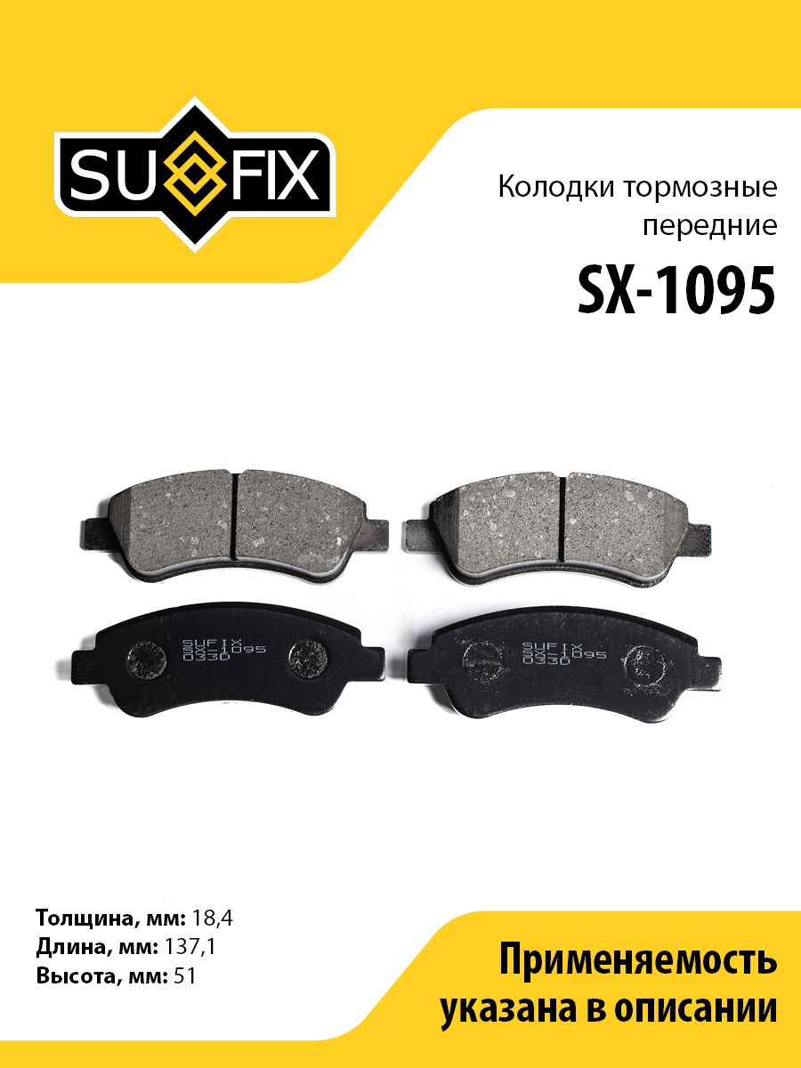 Колодки тормозные передние SUFIX SX-1095. Применение: CITROEN C3/C4/Berlingo 01> / Xsara >05/Xsara Picasso 00>, PEUGEOT 1007/206/307 00> / Partner 96>. ОЕ: 425218; 425221; 425238; 425259; 425276; 425341; 425423; 425475; ZQ92190580 .