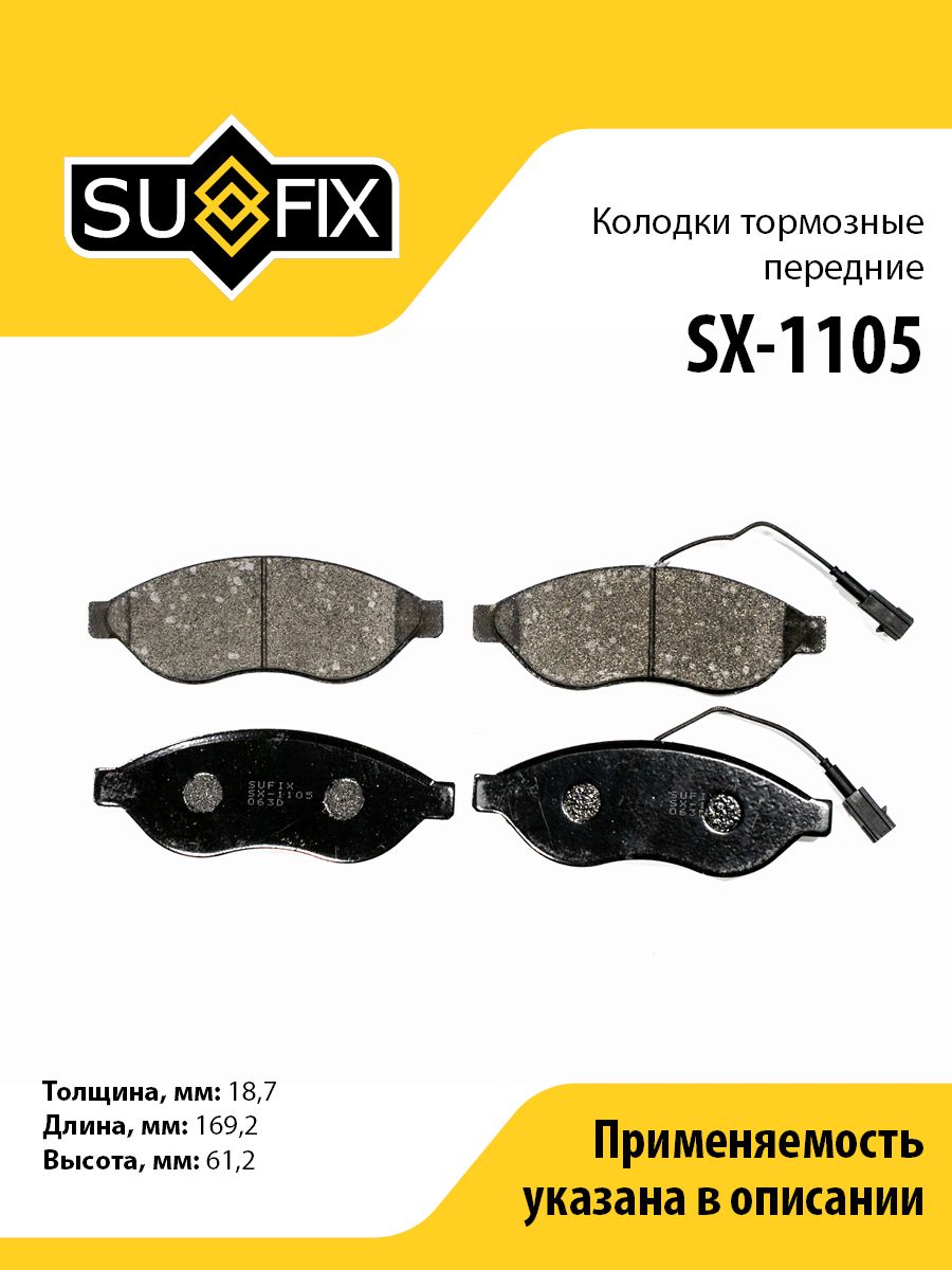 Колодки тормозные передние SUFIX SX-1105. Применение: CITROEN Jumper, FIAT Ducato, PEUGEOT Boxer 2.2D-3.0D 07>. ОЕ: 77364014; 77364160; 425355; 425356; 425357; 425358; 425461 .