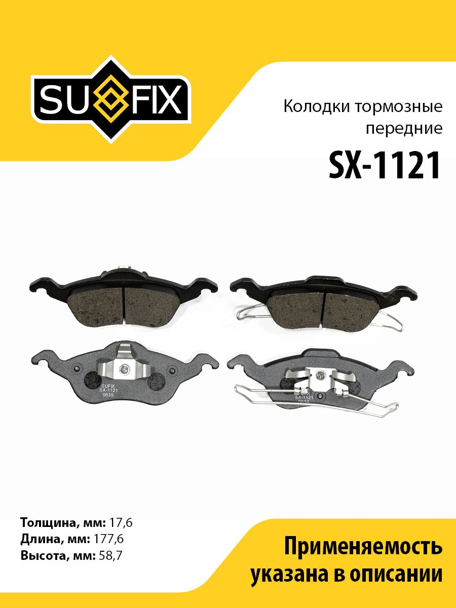 Колодки тормозные передние SUFIX SX-1121. Применение: FORD Focus I 98>. ОЕ: 1075558; 1107697; 1136519; 1151049; 1425406; 2M5Z2001AA; 3S4Z2001AA; 98AB2K021AD; 98AX2K021AD; 98AX2K021AE; 98AX2K021AF; 98AX2K021AG; YS4Z2001AA; YU2Z2V001KA .