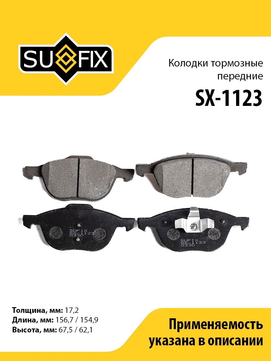 Колодки тормозные передние SUFIX SX-1123. Применение: FORD Focus II/Focus C-Max/Kuga 08>, MAZDA 3 03> / MAZDA 5 05>, VOLVO C30 06> / S40 04>. ОЕ: 1223682; 1321517; 1360305; 1508074; 1519528; 1566093; 30681739; 30683554; 30715023; 30742030; 306817390; 307150230; 307369230; 307936180; 3M512K021AA; 3M512K021AB; 5S4Z2001AA; 7M512K021AALC; 8V412K021AA; AV612K021BB; B3YH3323Z; B3YH3323ZA; BPYK3323Z; BPYK3323ZA; BPYK3323ZA9C; C2Y33323ZA; ME3M5J2K021AA .