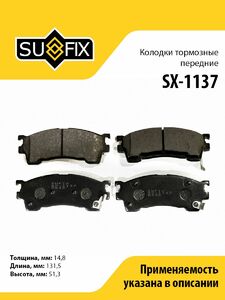 Колодки тормозные передние SUFIX SX-1137. Применение: FORD Probe 93-98, MAZDA 626 >97/MX-6 91> / Xedos 6 92>. ОЕ: 3894048; 3922123; F32Z2001C; F62Z2001BA; G5Y63323Z; G5Y63328Z; GAYR2323ZB; GAYR2328Z; GAYR2328ZA; GAYR3323ZA; GAYR3323ZB; GAYR3323ZC; GAYR3323ZD; GAYR3323ZE; GAYR3328ZA; GAYR3328ZB; GAYR3328ZC; GAYR3328ZD; GCYD3323Z; GCYD3323ZA; GCYD3323ZB .