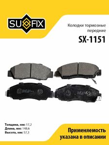 Колодки тормозные передние SUFIX SX-1151. Применение: HONDA Accord >02/Integra 98> / HR-V 98> / CR-V >02/Prelude >00/Legend 91-96. ОЕ: 586011849; 06450S0AJ00; 06450S0KJ11; 06450S2HJ00; 06450S7S000; 06450S84G00; 06450S87A00; 45022S10A01; 45022S10A02; 45022S10G00; 45022S30409; 45022S30A01; 45022S47000; 45022S47010; 45022S47020; 45022S47408; 45022S70000; 45022S70010; 45022SL0G00; 45022SL0G01; 45022SL0G02; 45022SL0J00; 45022SL0J01; 45022SLRG01; 45022SLRG02; 45022SM5525; 45022SM5A00; 45022SN7G50; 45022SP0A00; 45022SS0G00; 45022SS0G01; 45022SS0G02; 45022ST7R02; 45022SZ3E50; GBP90329; GBP90329AF; SFP100140EVA .