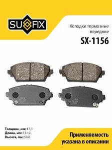 Колодки тормозные передние SUFIX SX-1156. Применение: HONDA Accord 98-02, NISSAN Almera Tino 00> / Primera(P12) 02>. ОЕ: 410604U125; 410604U126; 41060AV125; 41060AV126; 45022S1AE50 .