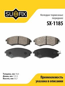 Колодки тормозные передние SUFIX SX-1185. Применение: HYUNDAI Elantra 00> / Lantra 98> / Sonata >01, KIA Magentis 01-05 . ОЕ: 5810120A00; 5810129A10; 5810129A50; 5810129A90; 5810129B00; 581012DA20; 5810133A00; 5810138A40; AA5010325 .