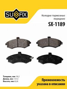 Колодки тормозные передние SUFIX SX-1189. Применение: HYUNDAI Elantra 1.6-2.0D 00-06/Matrix 1.5D-1.8 01>. ОЕ: 5810117A10; 581012DA30; 581012DA31; 581012DA40; 581012DA60; 581012SA31 .
