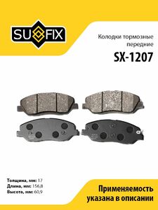 Колодки тормозные передние SUFIX SX-1207. Применение: HYUNDAI Santa Fe 06>, KIA Sorento 09>. ОЕ: 581012BA00; 581012BA10; 581012PA70; 581014DA60; 581014DU00 .