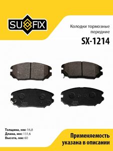 Колодки тормозные передние SUFIX SX-1214. Применение: HYUNDAI Sonata(NF) 2.0D-3.3 06> / Tucson(JM) 2.0 04-10 / Grandeur 2.2D-3.3 06>, KIA Sportage(JE) 2.0-2.7 04> / Magentis 2.7 05> / Opirus 3.8 06>. ОЕ: 58101-3FA01; 58101-3FA11; 58101-3KA20; 58101-3KA30; 58101-3KA32; 58101-3LA10; 58101-3LA11; 58101-3LA20.