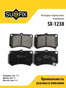 Колодки тормозные передние SUFIX SX-1238. Применение: KIA Rio >05, MAZDA 121 1.3 91-95/323 >98/MX-3 91>, . ОЕ: B4Y63323Z; B4Y63323ZA; B5Y63323Z; B5Y63323Z9A; B5Y63328Z; B5Y63328ZA; B5Y83323Z; B5Y83323ZA; BCYC3323Z; BCYW3323Z; BCYW3323ZA; BCYW3323ZC; BCYW3328ZA; BCYW3328ZA9F; BRY03328Z; BRY03328ZA; BRY73323ZA; BRYO3328Z; D1Y53328ZA; F1CZ2001A; F4BZ2001A; K0BA23328Z .