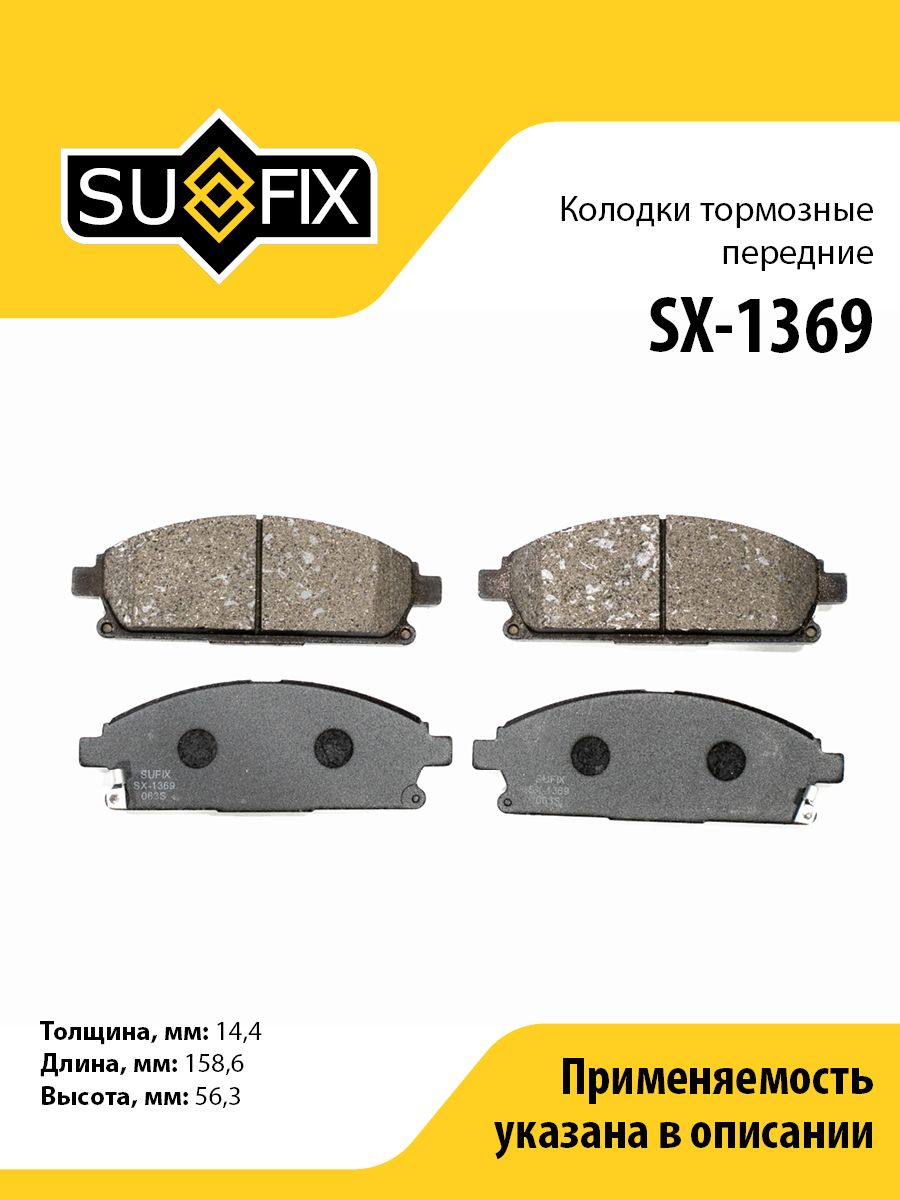 Колодки тормозные передние SUFIX SX-1369. Применение: NISSAN Elgrand(E51) 2.5-3.5 02-10 / Presage(U31) 2.5-3.5 03-06 / Terrano(R50) 3.3 99-00 / X-Trail(T30) 2.0-2.5D 00-13. ОЕ: 41060-CK025; AY040-NS112; D1060-CN91B.