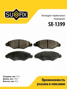 Колодки тормозные передние SUFIX SX-1399. Применение: PEUGEOT 206 1.1-1.9D 98> / 306 1.4-1.6 94-01. ОЕ: 4251.91; 4252.04; 4252.12; 4252.28; 4253.02; 4253.03; 4253.19; 4253.20; 4254.94; E172131.