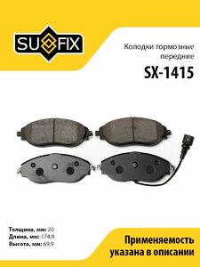 Колодки тормозные передние SUFIX SX-1415. Применение: SKODA Octavia(5E) 1.2T-2.0 12> / Superb(3V) 1.4T-2.0 15>, VW Golf VII 1.0-2.0D 12> / Passat 1.4T-2.0D 10> / Sharan 1.4T-2.0D 10>. ОЕ: 3C0698151E; 3C0698151F; 3C0698151G; 3C0698151H; 7N0698151A; 7N0698151B; 7N0698151C; 7N0698151D; 8V0698151C.
